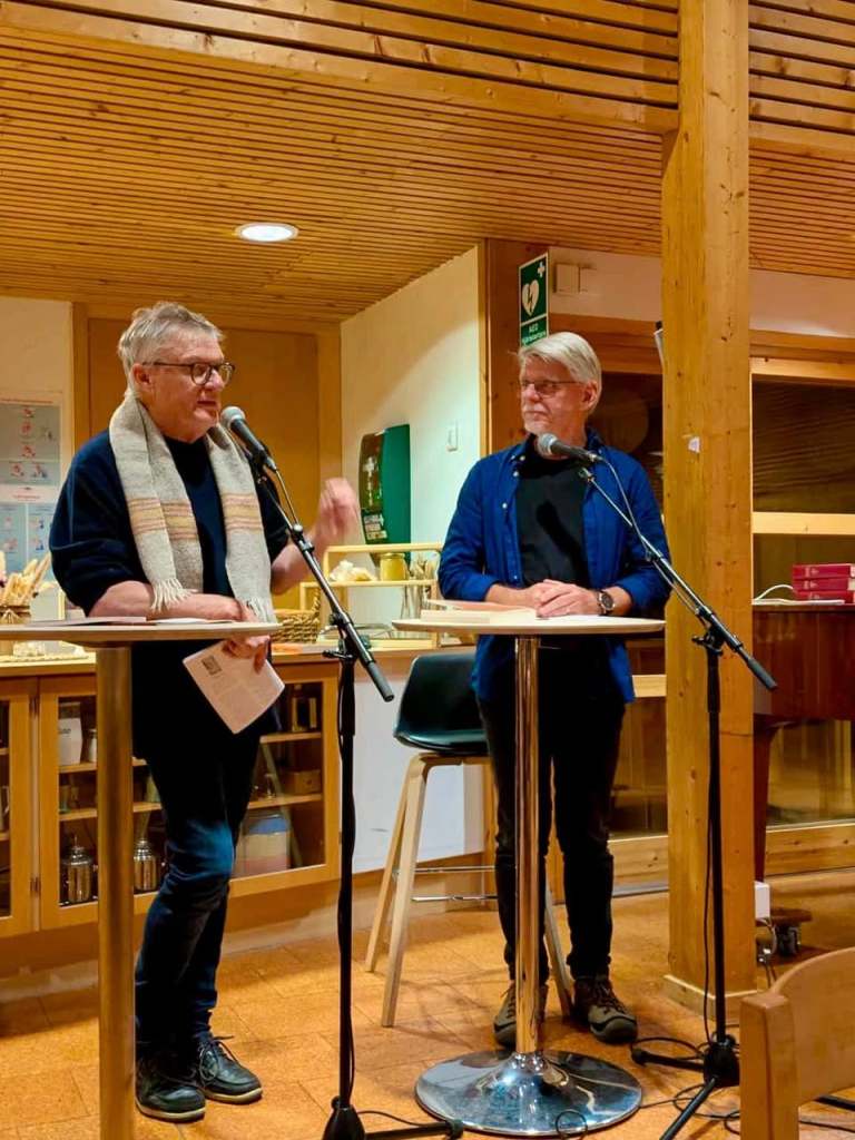 Därefter tog boksamtalet mellan Leif och Totte Jonsson vid. Tottes bok om genetiskt designade Sara och humanoiden (människolika maskinen) Theo. Samtalet kretsade kring artificiell intelligens, känslor, existentiella. Leifs berättelser kretsar kring kajaken, hur och varför människor konstruerade den och också om att leva i naturen med enkla medel. Både Tottes och Leifs böcker handlar om hur människor lever och löser problem i dåtid och i framtid.